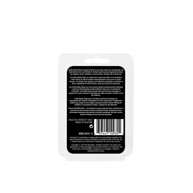 Firefly Bubble Rings are glow-in-the-dark cock rings made from exceptionally soft liquid silicone for a comfortable fit. Bubble rings ensure prolonged performance and heighten climax. Available in assorted sizes. Suitable with all lubricants.
