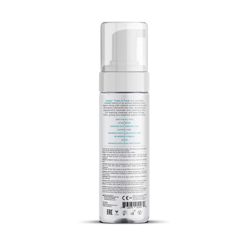 simply™ Foam and Fresh is a carefully crafted blend of an active antibacterial agent along with natural antimicrobial and antiseptic elements tea tree, eucalyptus, peppermint, lavender, and rosemary oils. Our foaming cleanser will keep things fresh, giving you playtime peace of mind.