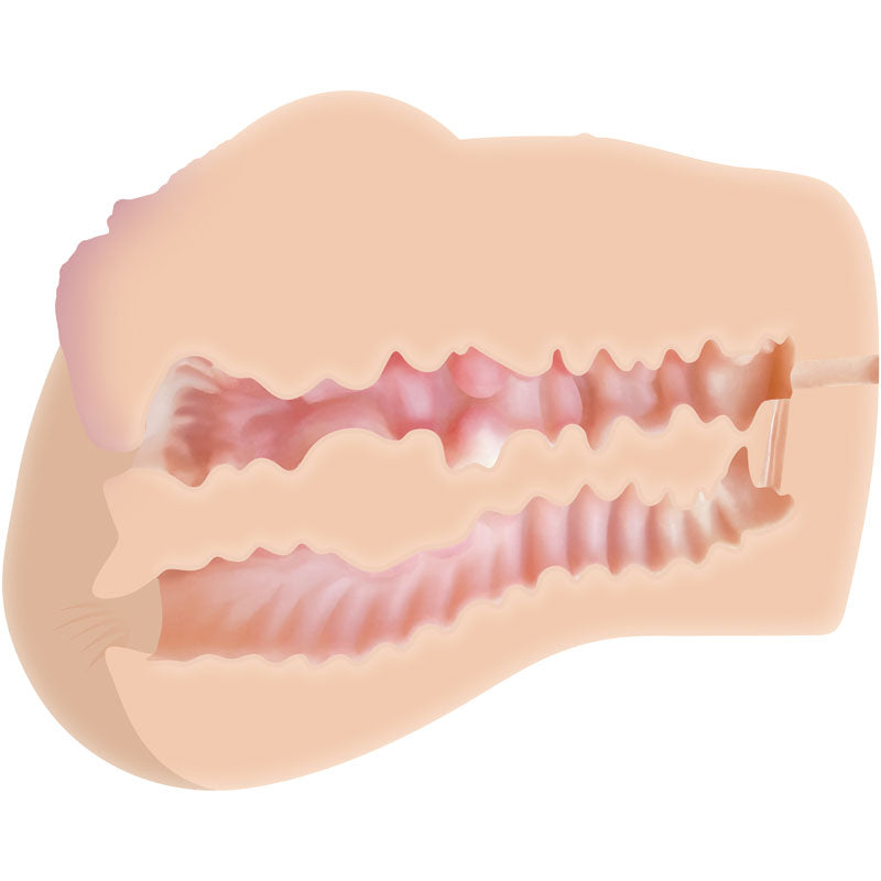 Fulfill your double fantasy with this two-channel stroker that lets you slip through the front door and bang the back door as hard as you want! Crafted with super-stretchy and pliable TPE rubber that moves with your body as you thrust, use the hips to hold on, and dive into that pink sweet spot primed with complimentary ZT lube. Feel the life-like tight fits of vaginal and booty canals all around you as you watch the notorious Dani Daniels for some superhot hardcore inspiration!