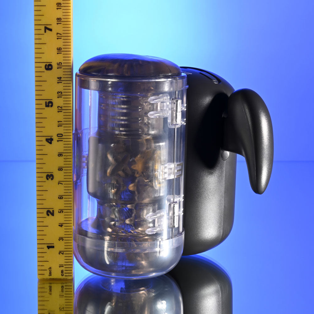 This unique vibrating, heated stroker thrusts at multiple speeds to keep up with your wildest fantasies. Get a comfortable grip on the gaming‑style handles on either side while you watch a complimentary erotic movie on your phone, which conveniently attaches to the end of the toy. Let the beaded inner channel surround you with soft yet firm textures that feel just like the real thing – and warm the whole sleeve with a quick double‑click. All motors are controlled separately via an easy‑to‑reach panel, and the sleeve detaches from its magnetic base for quick, fuss‑free cleaning.